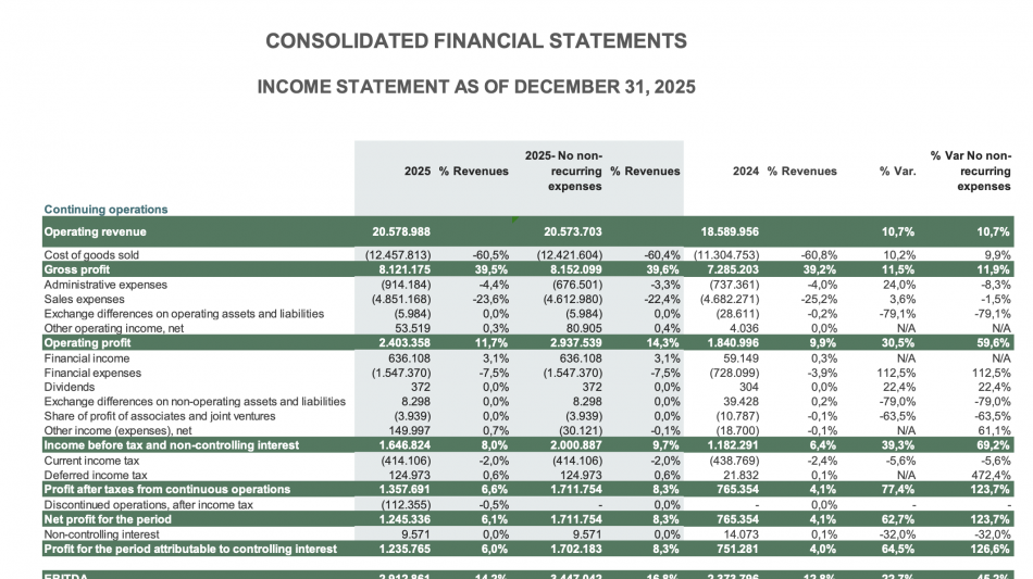 This performance reflects the results of the organizational transformation strategy initiated in early 2025, which focuses on efficiency, profitable investment, and a commitment to creating social, environmental, and economic value.