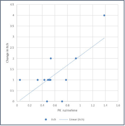 Pruritus is common in most liver diseases and the WI-NRS is a validated numerical rating scale displaying 11 numbers ranging from 0, representing "no itch," to 10, representing "worst imaginable itch," and patients are asked to pick the number corresponding to the intensity of their pruritus. Results from multiple large studies support the usefulness and validity of WI-NRS for evaluating change over time in clinical trials. Pearson's correlation coefficient (r) was used to assess the correlation between TH104 concentration (ng/ml) Area Under the Curve (AUC) and the change in WI-NRS score 48 hours after dosing.