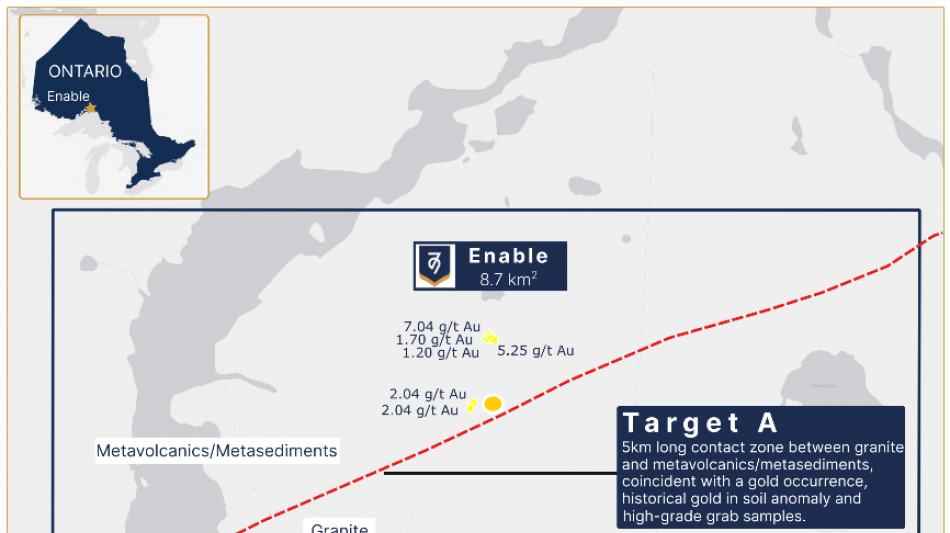 The Enable project is situated in the Schreiber-Hemlo greenstone belt and is prospective for gold mineralization. The project sits at the contact between a granitic igneous intrusion and metavolcanics/metasediments. Historical sampling close to the contact zone has identified high grade gold rock chip samples including 7.04 g/t Au and 5.25 g/t Au.