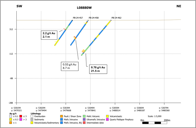 See Figure 2 below for section L08880W including drill holes PB-24-457, PB-24-458 and PB-24-462. Drill hole PB-24-462 returned 0.78 g/t Au over 21.5 metres including 7.45 g/t over 0.8 metres and 6.55 g/t Au over 1.0 metre focused along the litho-structural contact of mafic volcanic, argillite and the Philibert gabbro. The intersection is highly fractured, silicified with variable sulphide abundances. Drill holes PB-24-457 and PB-24-458 intersected the contact up-dip over narrow widths returning 2.2 g/t Au over 2.1 metres and 0.53 g/t Au over 8.7 metres respectively.