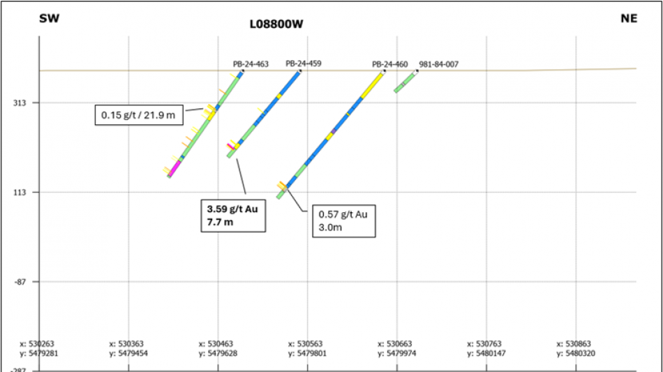 See Figure 3 below for section L08800W including drill holes PB-24-459, PB-24-460 and PB-24-463. Drill hole PB-24-459 returned 3.59 g/t Au over 7.7 metres including 8.53 g/t over 3.0 metres focused along the hanging wall litho-structural contact. The intersection is highly fractured, silicified and host variable sulphide abundances. Drill hole PB-24-463 intersected the contact up-dip across significant widths with modestly anomalous grades and further downhole intersected some isolated anomalous values that correspond to mineralized zones along strike from historic drilling. PB-24-463 also intersected a quartz feldspar porphyry interval at the base of the hole that returned some weakly anomalous background gold values. Drill hole PB-24-458 intersected the contact down dip although at lower grades and widths but may have been drilled short of the new interpreted zone. This is also the case for drill hole PB-24-461 drilled 80 metres east of section L08800W where the last sample returned 0.40 g/t over 1 metre. The Company is planning to extend this hole in the near future.