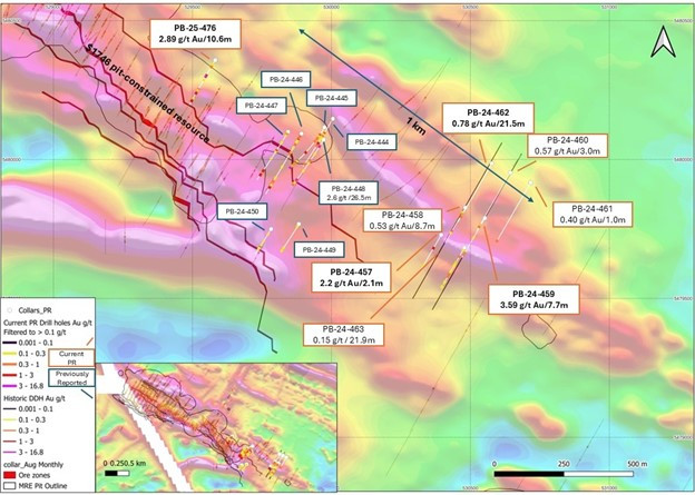 Drillholes PB-24-457 through PB-24-463 targeted the hanging wall zone from 700 to 900 metres east of the current Mineral Resource Estimate ("MRE") pit. Results confirm the potential for further expansion along strike, demonstrating both higher-grade intervals and broader zones of lower-grade mineralization. These drillholes extended exploration beyond the pit boundary and tested potential mineralization in previously unexamined sections over a 185-metre strike length. Drill hole PB-25-476 tested the Grey Fox zone under the current Mineral Resource Estimate ("MRE") pit. See Figure 1 for a plan map of the drilling.