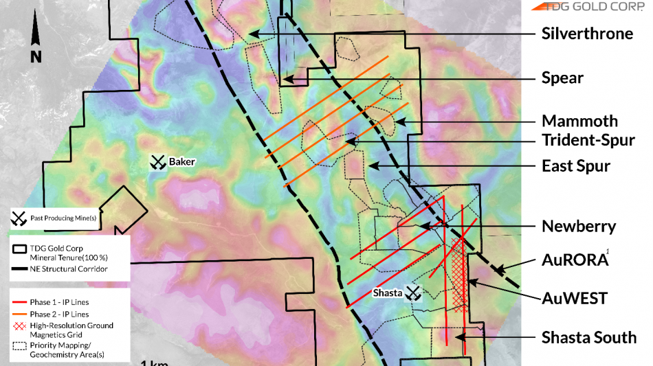 Field activities will start with a combination of: (i) soil and rock geochemistry, (ii) Induced Polarisation ("IP") geophysics, (iii) Time-domain electromagnetic geophysics, (iv) ground based magnetic geophysics and, (v) detailed geological mapping (Figure 3), followed by drilling, with the objective of defining copper +/- gold drill targets. The initial focus will be on the area encompassing the Greater Shasta, Newberry and AuWEST areas and will then expand to cover key parts of the 12 kilometre ("km") structural corridor previously defined by TDG (news release Mar 03, 2025). This corridor hosts the Freeport-Amarc AuRORA1 discovery along with TDG's Trident target (news release Mar 07, 2024) and East Spur target (news release Mar 03, 2025).