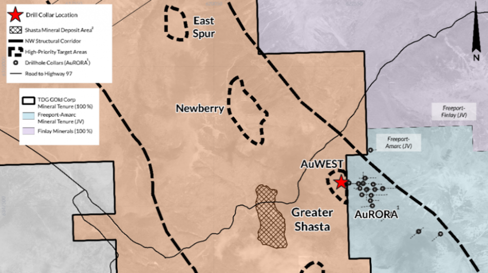 In 2023, TDG defined the 5.5 sq.km Greater Shasta-Newberry exploration target area (news release Jan 25, 2023) which is located directly adjacent to the gold-rich copper porphyry AuRORA1 discovery announced by Freeport McMoran Inc. and Amarc Resources Ltd. (news release Jan 17, 2025).
