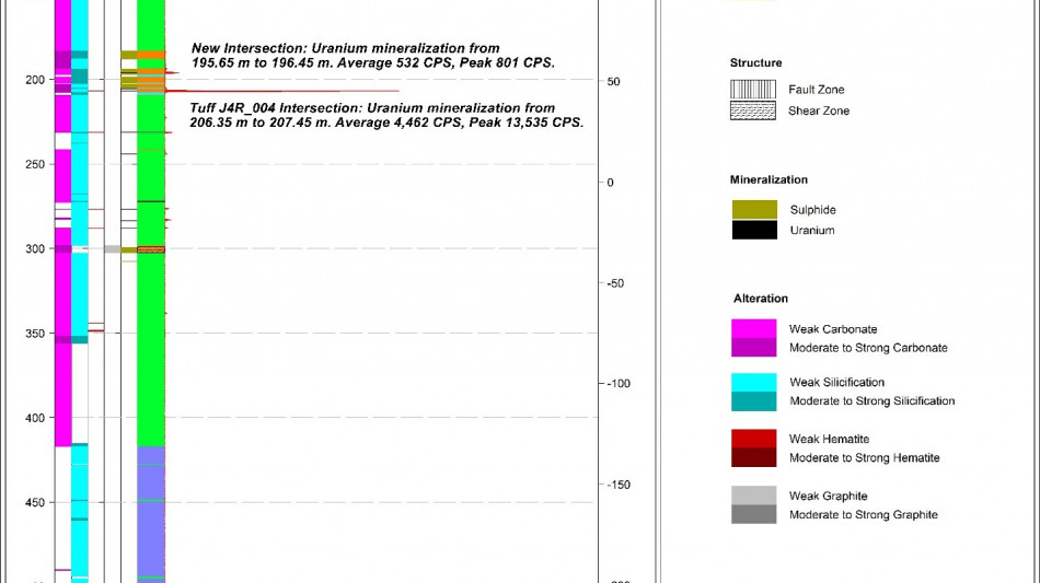 The maiden drill hole at the KU Discovery Target intersected five zones of uranium mineralization, including a shallow high-grade lense. The results demonstrate the Company's thesis that the Angikuni Basin is a direct analog to the Athabasca Basin, and that the 31 km RIB-Nine Iron Trend remains prospective for additional discoveries. At the Lac 50 Deposit, the first hole drilled at the J4/Ray Zone along the Lac 50 Trend intersected four zones of uranium mineralization, expanding the down-dip extents of the envelop of mineralization. J4R-DD-091 demonstrates that the Lac 50 Deposit remains open and unconstrained.