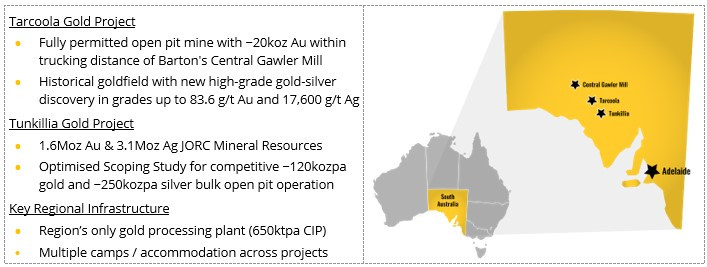 Barton Gold is an ASX, OTCQB and Frankfurt Stock Exchange listed Australian gold developer targeting future gold production of 150,000ozpa with 1.7Moz Au & 3.1Moz Ag JORC Mineral Resources (64.0Mt @ 0.83 g/t Au), brownfield mines, and 100% ownership of the region's only gold mill in the renowned Gawler Craton of South Australia.*