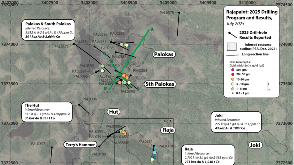 Palokas: Drilling at deep Palokas consisted of 5 holes in total, all targeting down-dip extensions of the Palokas gold-cobalt system. Drillholes PAL0380 and PAL0386 intercepted significant mineralisation, where PAL0380 recorded multiple significant intercepts (recording a best of 6 m @ 1.03 g/t gold; as reported in previous release dated February 11, 2025), and PAL0386 intercepted a single, thinner interval of 1.05 m @ 2.26 g/t Au (cobalt results not yet received).