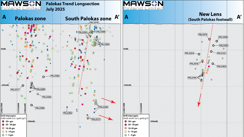 Figure 3: Long-section illustration of the Palokas and South Palokas zones (left) and New Lens zone as located in the footwall of South Palokas (right) as projected onto the same panel. Intercepts from 2025 are highlighted with drillhole numbers in bold. Red dashed line represents the projection of the South Palokas cross-section as presented in Figure 4 (location of section lines illustrated in Figure 1; A and A'). Red arrows indicate the direction where gold-cobalt mineralisation remains untested and open.