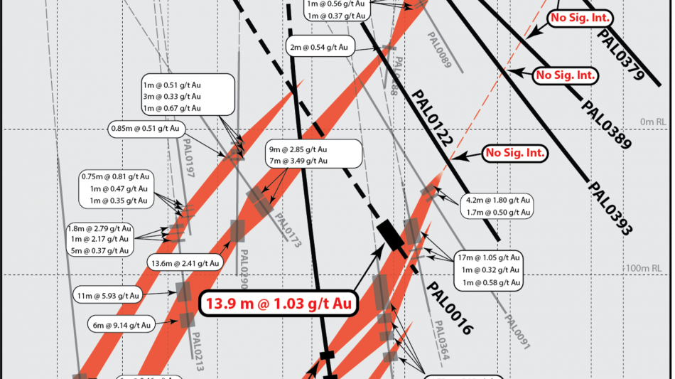 Discovery of a new gold-only occurrence of mineralisation situated approximately 300 m west of Raja in drillhole PAL0387, assaying 0.5 m @ 14.4 g/t gold, contained within a wider 9.8 m interval lower-grade zone.