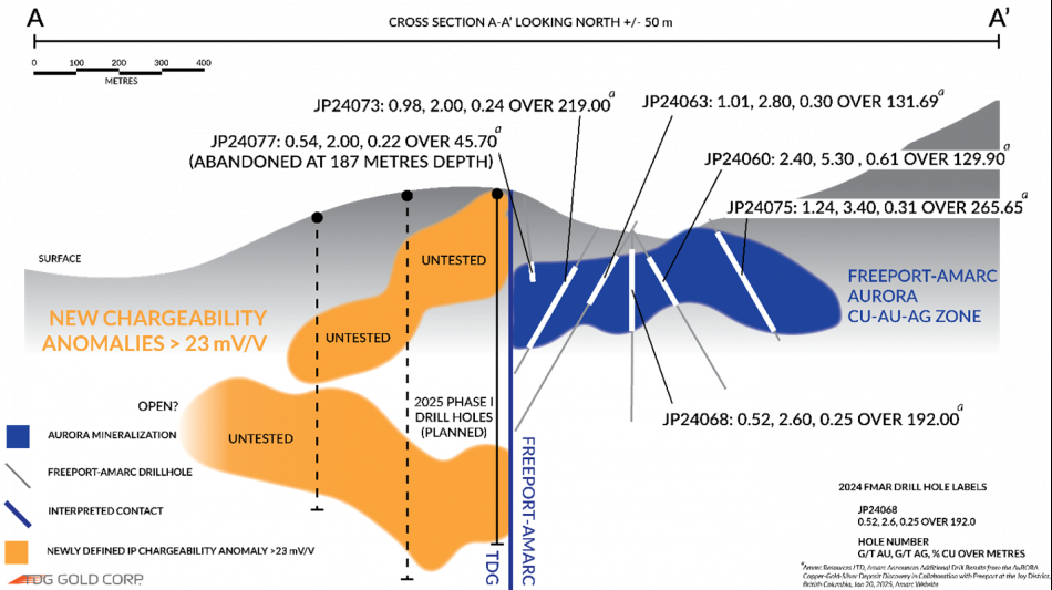 IP geophysical surveys are known to be an effective technique in identifying disseminated- and stockwork-style sulphides that are often associated with porphyry copper-gold-silver ("Cu-Au-Ag") mineralization, manifesting as a chargeability anomaly. The GSN project has never been surveyed with IP methods and, to date, the data from three wide-spaced lines completed adjacent to, and to the west of, AuRORA1 have been deemed fit for purpose and utilized for targeting at AuWEST, a potential extension to the AuRORA1 mineralization. The first line is located ~75 metres ("m") from the Freeport-Amarc boundary with 250 m spacing between the remaining lines (Figure 1). The purpose of this work was to better understand the geophysical signature of the AuRORA1 Cu-Au-Ag mineralization, to test for possible extensions of AuRORA1 onto TDG's mineral tenure, and provide a model for drill targeting potential AuRORA1 analogues along the 12 kilometre ("km") structural corridor identified on TDG's mineral claims (news release Mar 03, 2025).