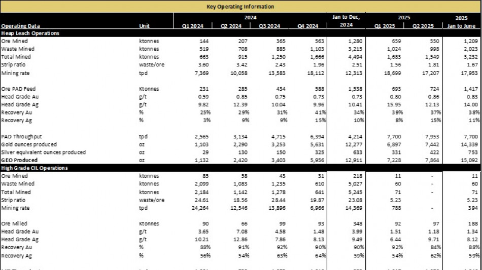 Gold Equivalent Ounce ("GEO") Production of 11,437 GEO for the 2nd Quarter 2025