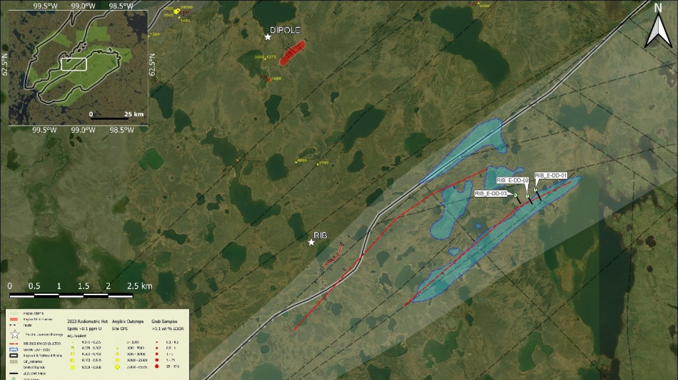 Troy Boisjoli, CEO commented: " The RIB East Discovery represents the second new discovery (first being KU Discovery) during the 2025 Angilak Exploration Program, beyond the Lac 50 Deposit Trend in the Angikuni Basin. These results continue to confirm the Company's exploration approach and thesis, while demonstrating our technical team's ability to execute and discover. The Company is thrilled with the fact that the RIB East Discovery has high-grade mineralization hosted within a graphitic structure - a known setting for mineralization in all major Athabasca Basin deposits and mines. We are at the early stages of understanding the potential of RIB East, with drilling covering just 400 m of a 2 km long anomaly. The early successes of the 2025 Angilak Exploration Program truly illustrate how underexplored and robust the mineralizing system is in the Angikuni Basin."