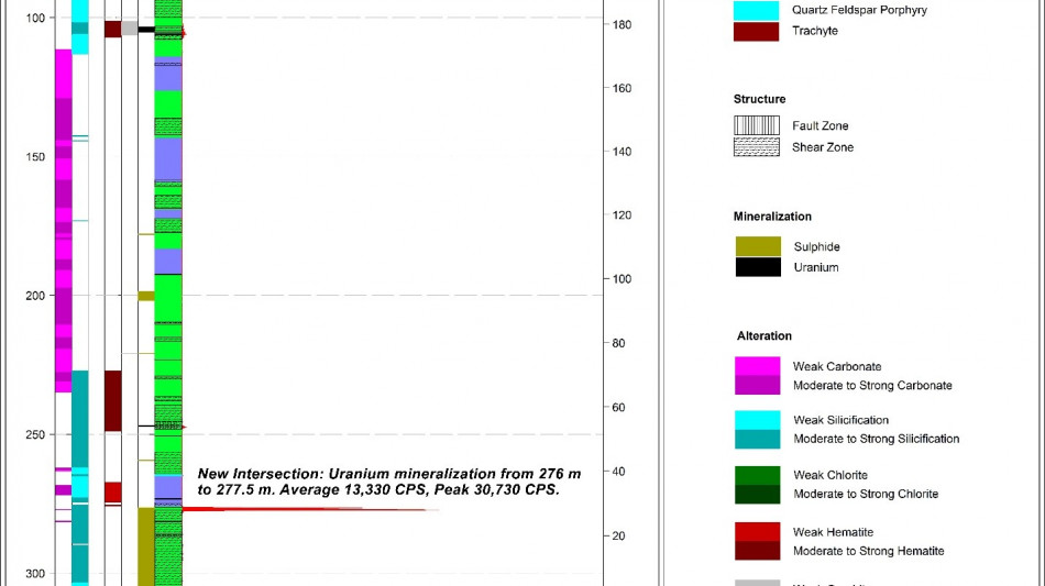 RIBE-DD-003, intersecting total composite mineralization of 2.1 m with continuous shallow mineralization over 1.5 m interval (276 m to 277.5 m) within a graphitic shear - analogous to uranium mineralization controls seen in Athabasca Basin deposits and mines - including continuous high-grade mineralization (>10,000 CPS) over a continuous 1.0 m with max radioactivity of 30,730 CPS 1 (Figure 3a, b & 6) and a lower grade mineralized fracture intersected between 372 m and 372.6 m. RIBE-DD-003 was drilled 200 m along strike of RIBE-DD-002 and 150 m further into the hanging wall of an interpreted NW trending fault zone.
