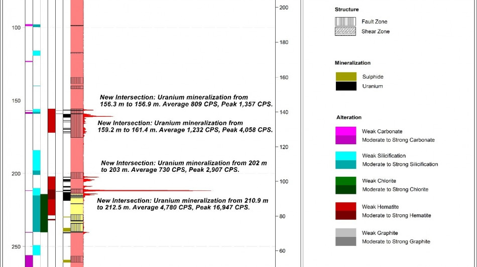 RIBE-DD-002, intersecting shallow high-grade uranium mineralization as well as numerous zones of lower-grade mineralization throughout the hole. The hole intersected total composite mineralization of 9.4 m, including a continuous shallow zone (between 210.9 m and 212.5 m) of 0.3 m of high-grade mineralization that had max radioactivity up to 16,947 CPS 1 (Figure 3a, b & 5) ;