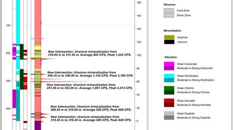 Cliff Revering, VP Exploration added: " The success of our first 3 holes in the RIB target area continues to demonstrate the effectiveness of our targeting strategy being employed at our Angilak Project. As well, with new discoveries at both the KU and RIB targets during our first exploration campaign along the 31 Km Rib-Nine Iron structural corridor, we remain confident in our view that the Angikuni Basin is an emerging uranium district and highly prospective for discovery of additional uranium deposits. "
