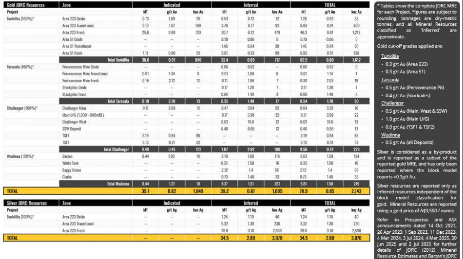 * Refer to Barton Prospectus dated 14 May 2021 and ASX announcement dated 25 July 2025. Total Barton JORC (2012) Mineral Resources include 1,049koz Au (39.7Mt @ 0.82 g/t Au) in Indicated category and 1,095koz Au (39.2Mt @ 0.87 g/t Au) in Inferred category, and 3,070koz Ag (34.5Mt @ 2.80 g/t Ag) in Inferred category as a subset of Tunkillia gold JORC (2012) Mineral Resources.