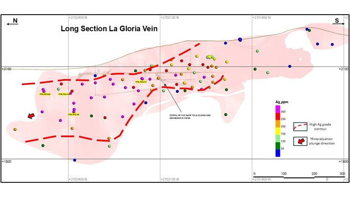 The variation of grades and thicknesses within relatively short distances (under 10 metres) compared with previously drilled intercepts were expected due to the "pinch and swell" geometry of the La Preciosa veins and the high nugget effects. The drill results exceeded grade expectations and verified the geometry of the current vein-based resource model. Higher grades intersected in the northern portion of the La Gloria Vein (in hole PMLP-25-02) are expected to continue further to the North and warrant additional step-out drilling to potentially expand the mineral resource defined on the shallow La Gloria Vein.