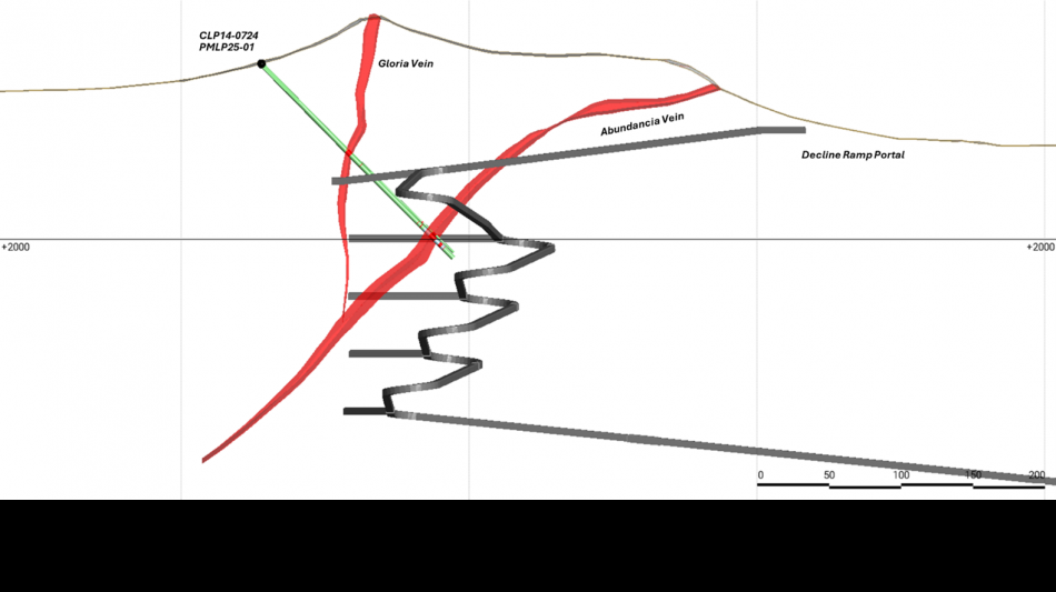 Figure 4 - Cross-Section of PMLP25-01, looking North, Showing the Abundancia Vein, the La Gloria vein and the Projections of the Decline Ramp.