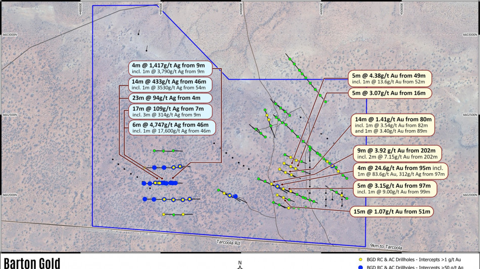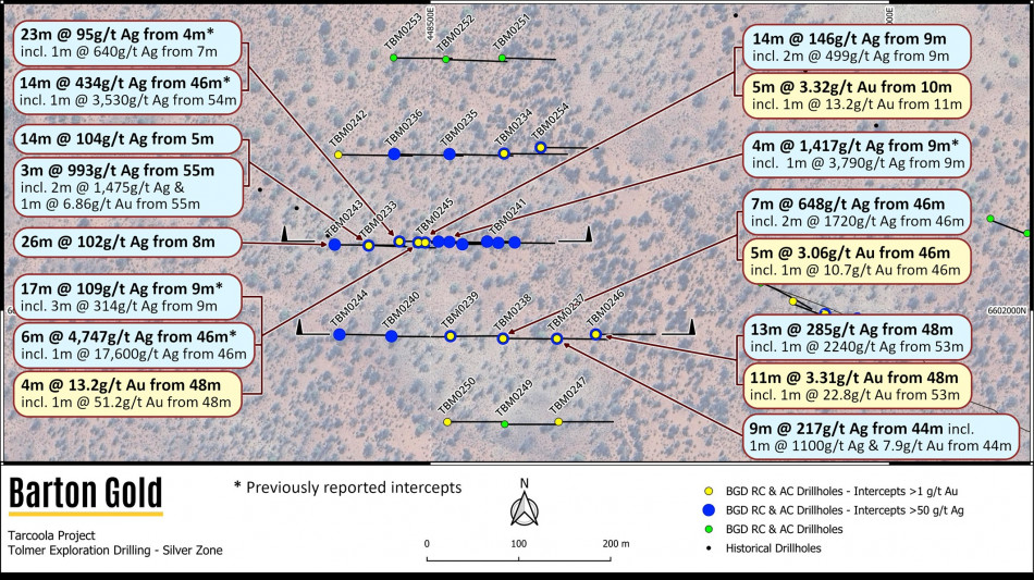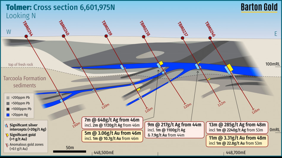 In July 2025 Barton completed a soil sampling program over a ~1.9km2 area surrounding the 'Tolmer' high grade silver and gold discoveries, collecting ~430 samples with assays expected during September 2025.6
