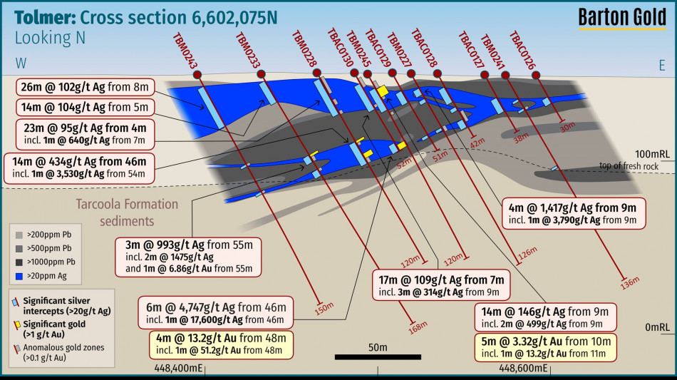 During August 2024 Barton announced a Tolmer high-grade gold discovery and then, during March 2025, Barton announced one of Australia's highest-grade modern silver discoveries ~500m further west.3 These neighbouring 'eastern gold zone' and 'western silver zone' discoveries have yielded grades up to 83.6g/t Au and 17,600g/t Ag, respectively, with high-grade gold and silver present in each zone.3