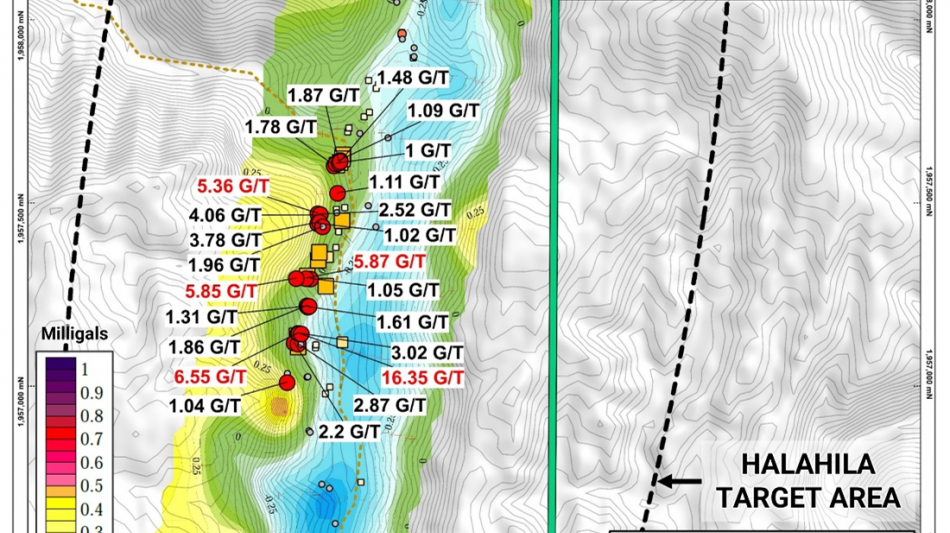 Figure 1. Halahila target area showing gold-in-rock geochemistry from rock-chip and grab sampling program.