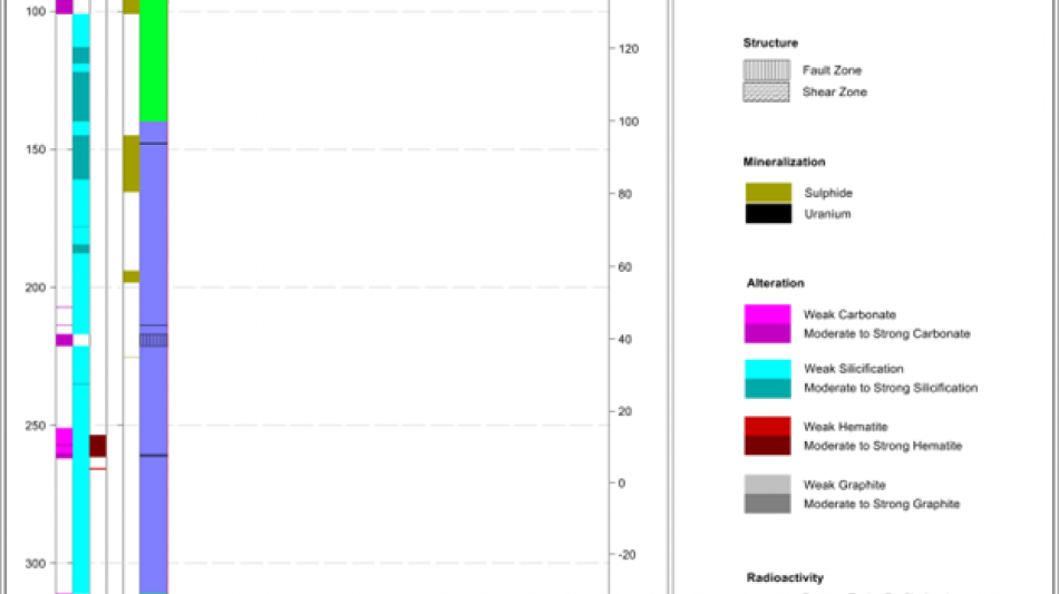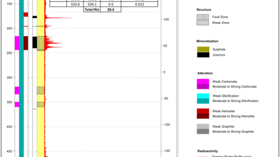 Figure 3: Striplog KU-DD-001 showing mineralized interval with composite uranium mineralization1 with average grades - derived from assay samples.