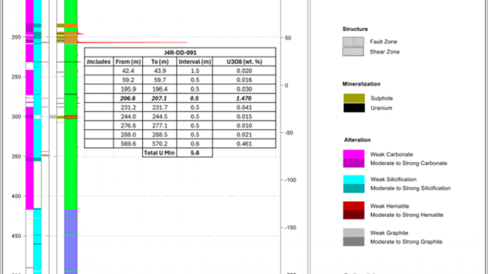 Figure 7: Striplog J4R-DD-091 showing mineralized interval with composite uranium mineralization1 with average grades - derived from assay samples.