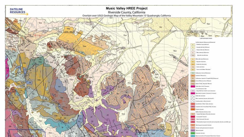 In February 2026, Dateline announced the acquisition of the Music Valley Heavy Rare Earth Project in Riverside County, California. The region has known HREE mineralisation from USGS rock chip sampling, however it has not been subjected to modern exploration techniques.